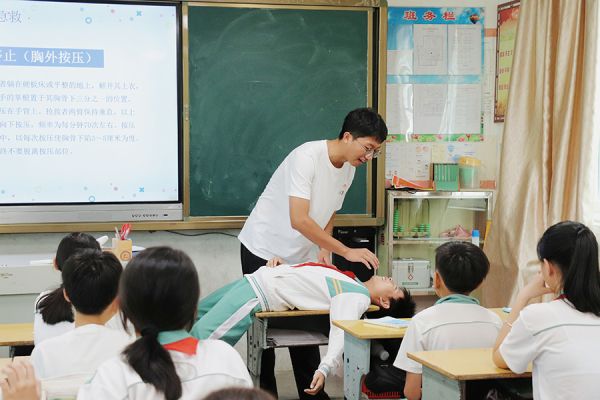 华南师范大学“漫行潮寨队”成员在教潮州市潮安区市尾小学学生学习急救相关知识 王馨/摄