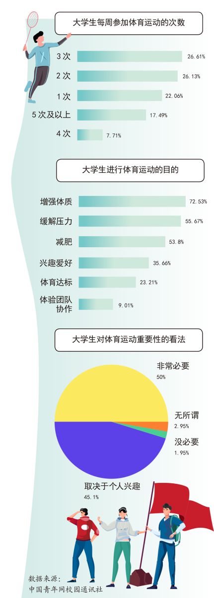 研究证实,坚持体育锻炼可以在青少年的心肺功能、血脂、胰岛素敏感性、血糖浓度等方面发挥积极的作用。青年学生参与体育运动不仅可以缓解不良生活习惯带来的不适,更能促进身心健康发展,然而近期一项调查显示:近五成大学生每周运动不足三次,加强大学生体育运动已刻不容缓。