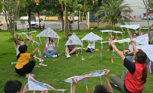 为提高青少年对于乡村文化的认同感,挖掘孩童眼中的车村形象,团队在陈小平的帮助下,与车村村妇女联合会共同开展“五彩车村,梦想与凤同行——DIY风筝”乡村文化活动。车村的变化,青少年们也看在眼里。他们用画笔在风筝上画下了家乡的模样,他们天马行空、大胆创新,展现出车村青少年儿童们丰富的想象力与活跃的思维能力。团队成员融入车村,和孩子们一同坐在草坪上尽情绘画,形成了车村一道特别的风景。