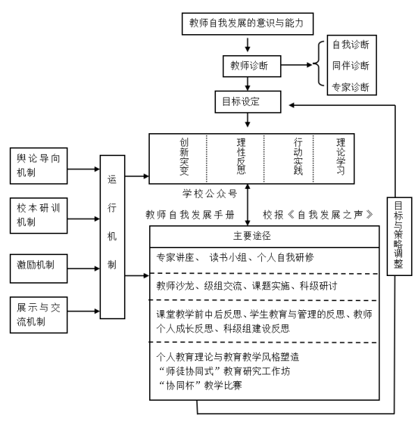 与此同时,学校做好教师自我发展的顶层设计,从认知、情感、技能三个层面强化、丰富教师间联系,增强教师的自组织性,促进教师协同共进。