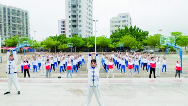 开步屈膝,仰头翻掌,两手攀足,呼气吐气……湛江市坡头区龙头中学的操场上,伴随舒缓的中国传统音乐,百余名中学生正在集体练习着八段锦。青年医师志愿者手把手教学,让学生们学习领悟八段锦的动作和内涵。
