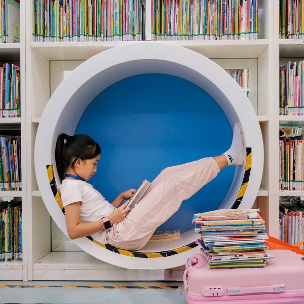 小读者挑选了一叠图书,舒展地倚靠并阅读自己喜爱的图书 袁彬/摄