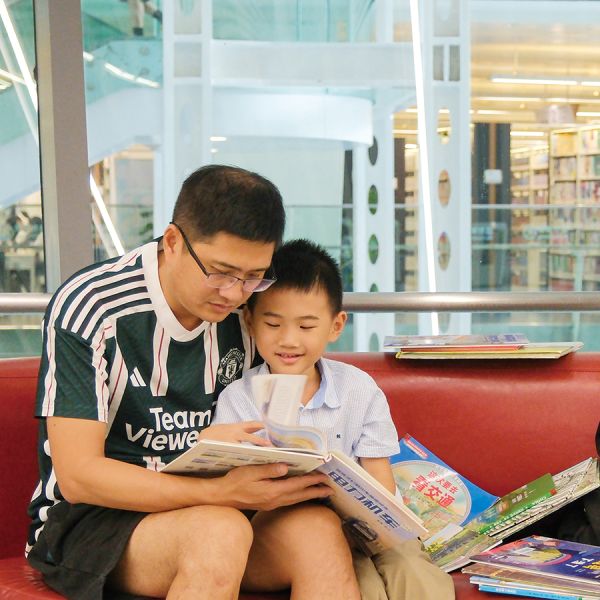 爸爸陪同孩子一起阅读图书,快乐学习交通知识 袁彬/摄