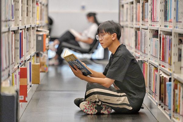青年在图书馆书架过道席地而坐,认真翻阅 白洁/摄