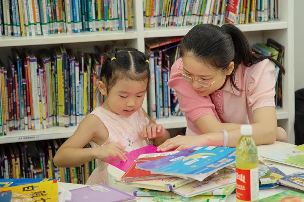 在广州图书馆亲子绘本阅读馆,妈妈陪伴着女儿一起阅读儿童绘本 韩贵凯/摄