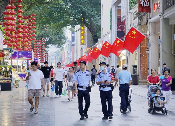 两位民警在北京路步行街上巡逻,确保市民过一个祥和平安的中秋节和国庆节 吴启光/摄