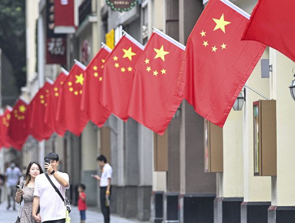 在北京路步行街上,两位市民拿着手机,对着身后的国旗进行自拍 白洁/摄