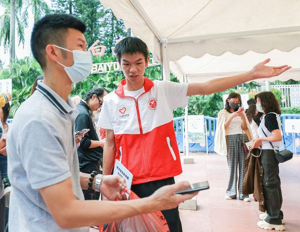 青年志愿者为市民群众开展登高指引、秩序维护等志愿服务